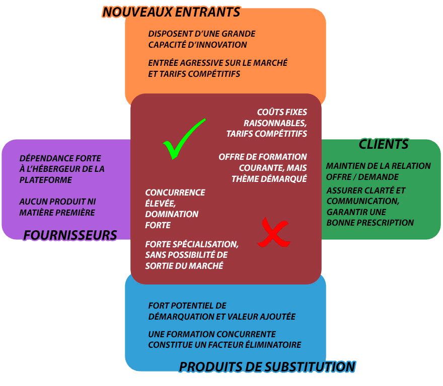 La matrice des cinq forces de Porter va permettre d’éclairer sur les vecteurs de réussite, notamment humains, qui sont en jeu ici. Cette vision entrepreneuriale du projet de formation doit ouvrir la voie à des décisions structurelles et organisationnelles rigoureuses pour la bonne marche de ce dernier.
